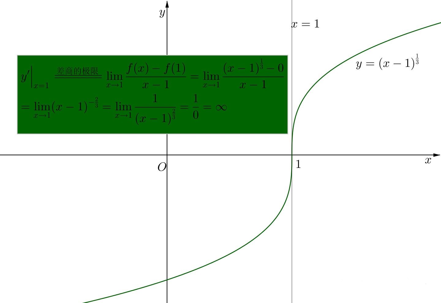 如果 Δx→0limΔxΔy=∞,这时y=f(x) 在 x0 处不可导,但是有时候也说 y=f(x) 在 x0 处的导数是无穷大,此时曲线y=f(x) 在 x0 处的曲线垂直于 x 轴,如下图: